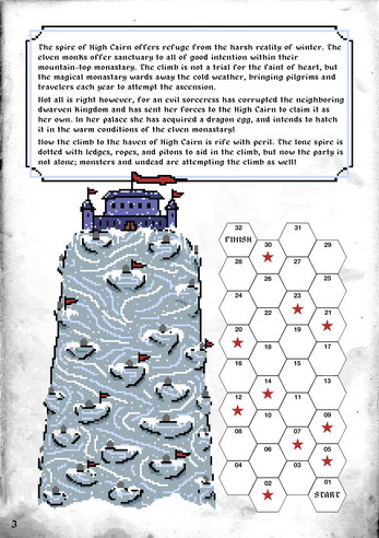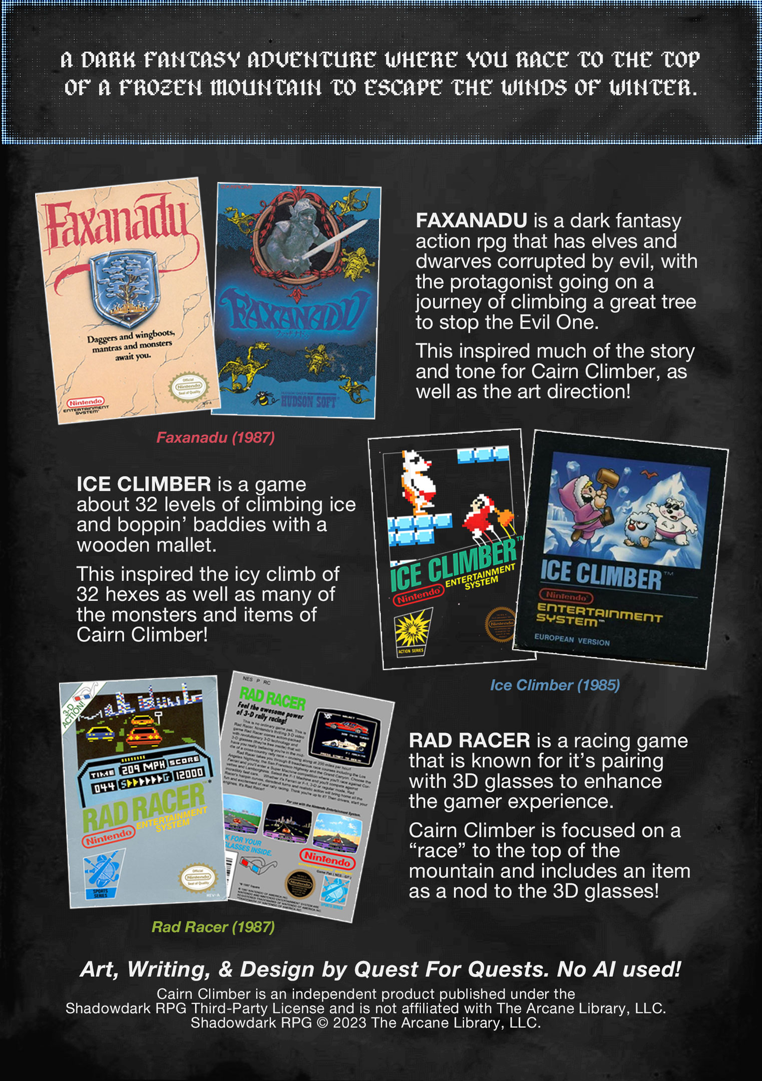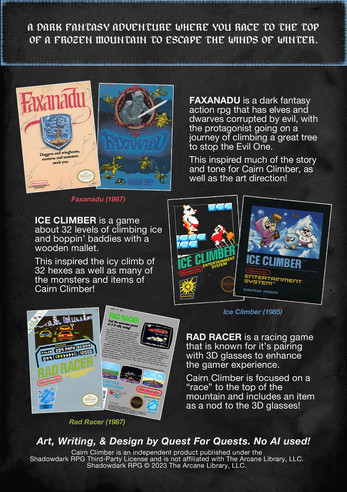 Cairn Climber is a 3rd level "hex climb" for the Shadowdark TTRPG. Submitted as part of the Shadowdark 8 bit Game Jam (2026), it contains inspiration and influences from the NES titles: Faxanadu, Ice Climber, and Rad Racer.